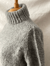 The sweater is knitted from top to bottom. You provisionally cast on the turtleneck and work it in mostly 1x1 ribbing with the knit stitches worked through back loop. After knitting double the length of the turtleneck, you knit the sts of the provisional cast-on together with the working sts. While shaping the shoulder with increases you shaping the neckline with German shortrows. Afterwards you start to increase the sts for body and sleeves every other round. After body and sleeves are separated, the body is worked first, in stockinette stitch with a purled false seam, to the desired length and finished with a hem in 1x1 ribbing. Then the sleeves are worked in purl stitch with two lines of k-tbl stitch as seams running down to the cuff. Cuff is worked in 1x1 ribbing like the body.