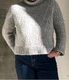 Der Pullover wird von oben nach unten gestrickt. Gestartet wird mit einem provisorischen Maschenanschlag des Rollkragens. Dieser wird in 1re1li Muster gestrickt, wobei die rechten Maschen verschränkt gestrickt werden. Nach erreichen der doppelten Rollkragenlänge, strickst du die provisorischen mit den aktuellen Maschen zusammen. Während dem Formen der Schultern mit Zunahmen wird der Ausschnitt gleichzeitig mit Hilfe von verkürzten Reihen geformt. Danach werden die Maschen für Körper und Ärmel in jeder zweiten Runde getätigt. Nach dem Trennen von Körper und Ärmel, wird der Körper bis zur gewünschten Länge in glatt rechts, mit einer falschen Naht auf jeder Körperseite gestrickt und mit einem Bündchen im gleichen Muster wie der Rollkragen beendet. Danach werden die Ärmel links gestrickt wobei zwei Linien in rechts verschränkt bis zu den Bündchen laufen. Das Bündchen wird im gleichen Muster beendet wie der Körper.