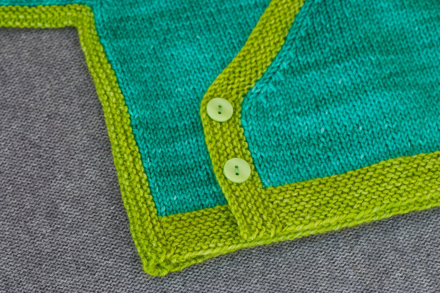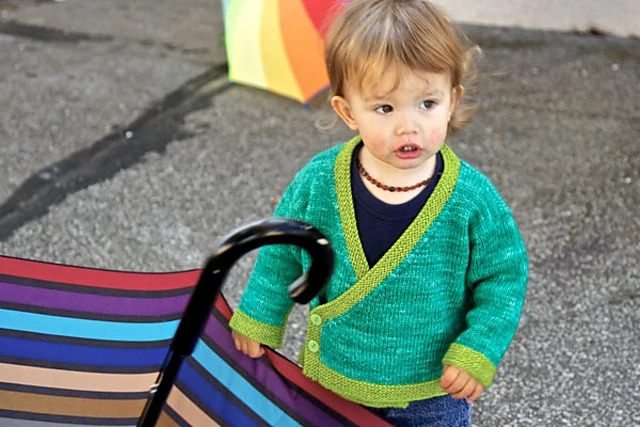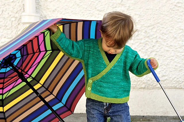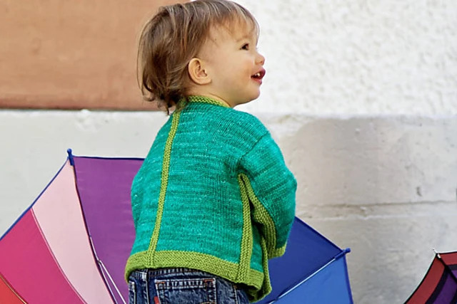 Flashes of colour pop in this cross-over style baby cardigan. With contrast-coloured garter stitch seams that are knitted-in rather than sewn, this sweater will be great fun to make and even more fun to wear.