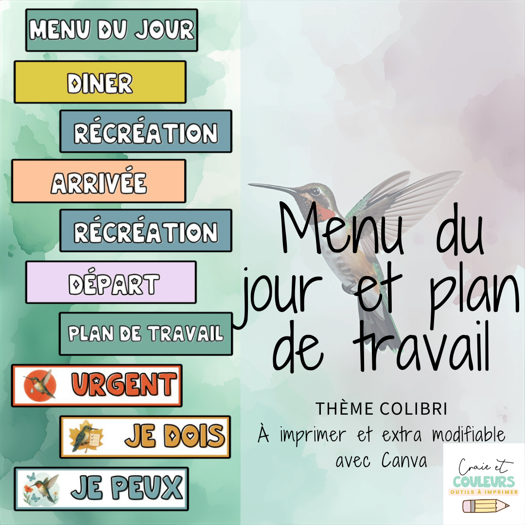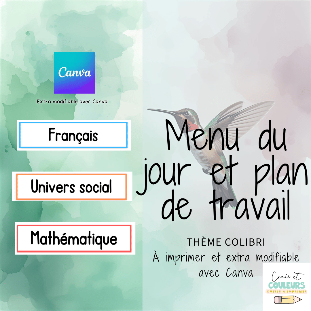 - Affichage du menu du jour (sans colibri, certaines étiquettes modifiables dans Canva)