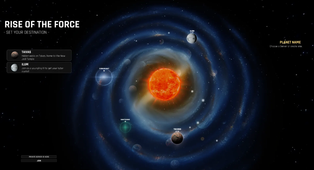 Input your game info in the configuration file and setup this file as the start place for the experience. Add the msger script from ServerScriptService to each of your maps shown in the main menu to accurately display the information in the menu. Make sure all joinable planets from the configuration script have a corresponding button and planet model in the workspace! That's all!