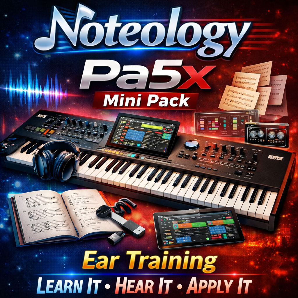 Start your journey with Noteology’s free mini guide and Pa5X keyboard set library, designed to train your ear to truly hear your sounds — not just look at the name. Perfect for beginners or anyone wanting to change the way they listen to their arranger keyboard.