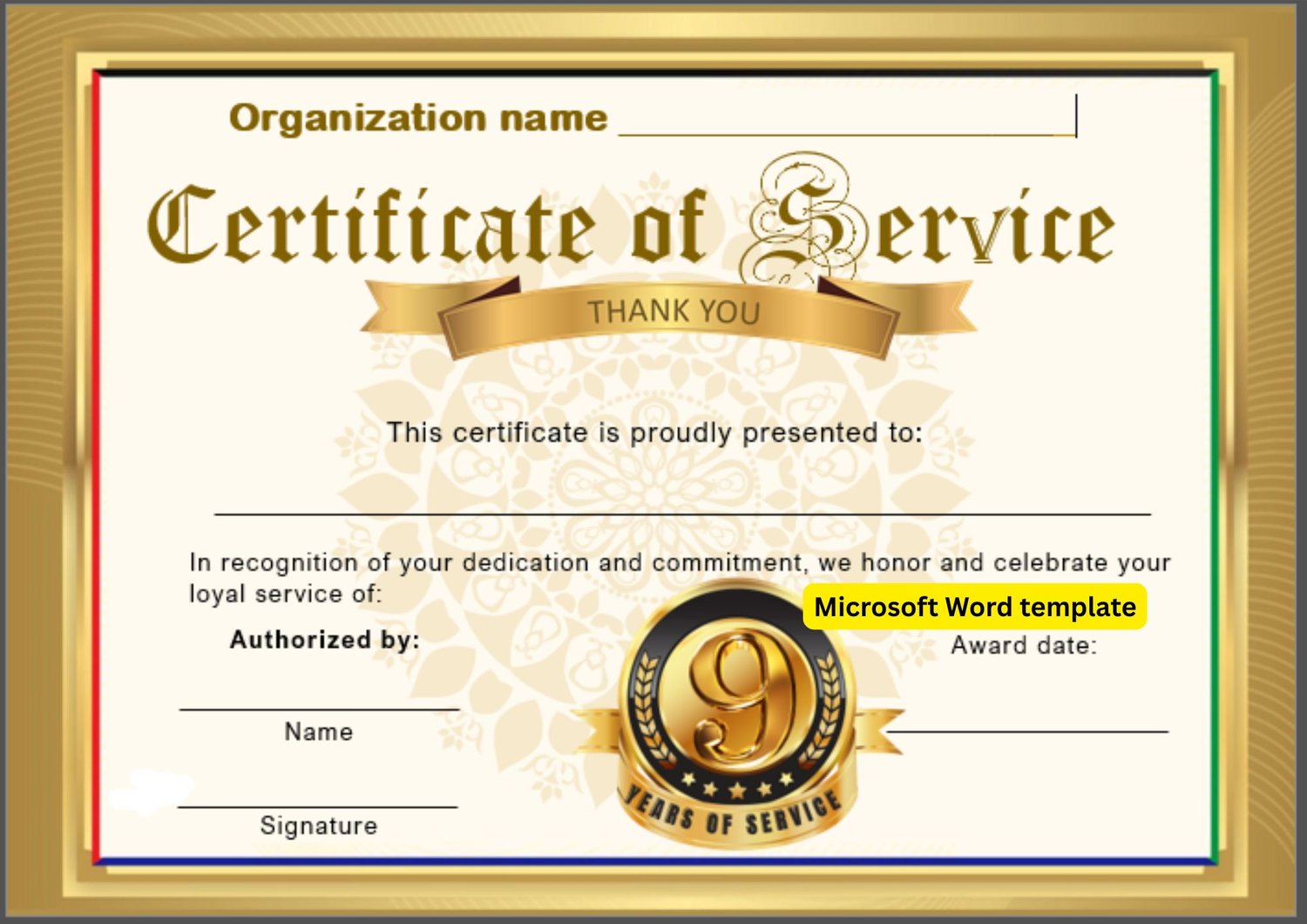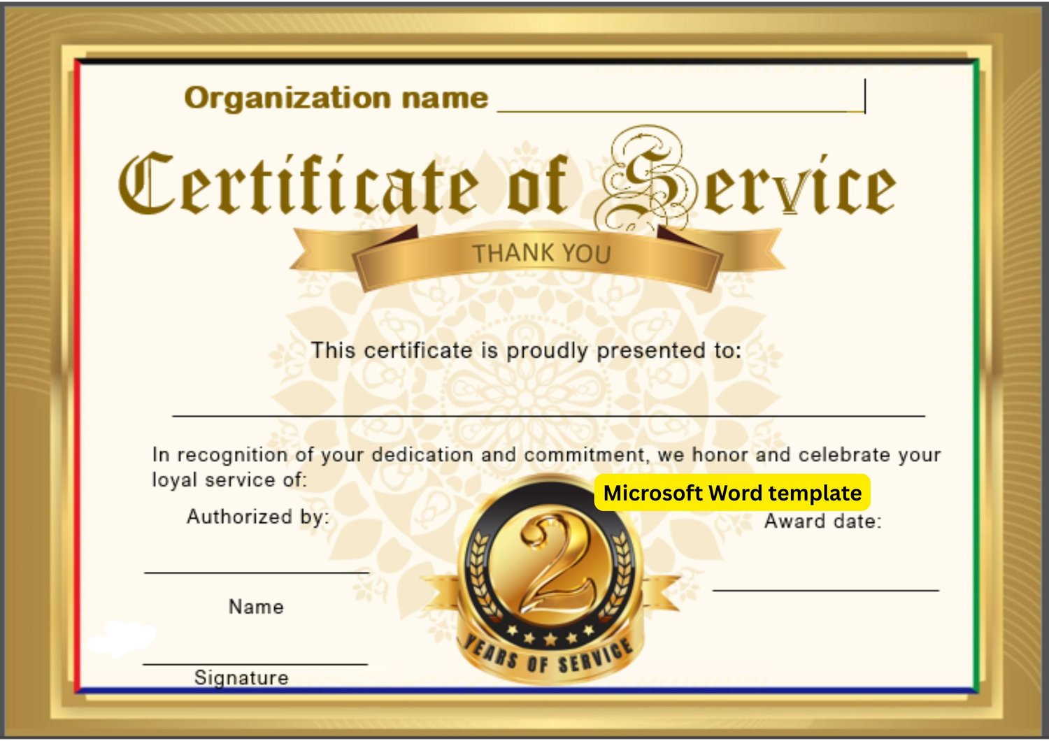 This is a professional landscape certificate template to recognize years of service. Fully editable in Microsoft Word — customize with names, dates, and details