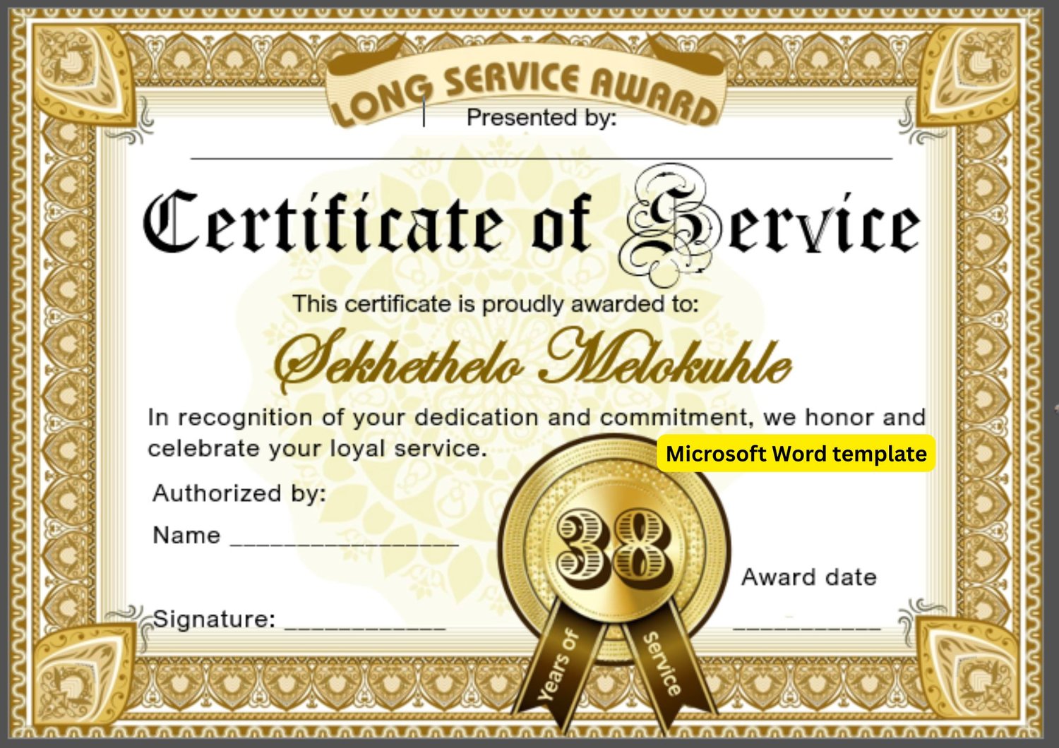 38 Years of service | Editable Microsoft Word template | Landscape