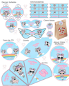 - Antifaces, Banderines para Sorbetes, Circulos para Sorbetes, Pochoclera, Cajita Almohadita para caramelos, Cajita Feliz, Tapa de Cd, Fajas para Cupcakes