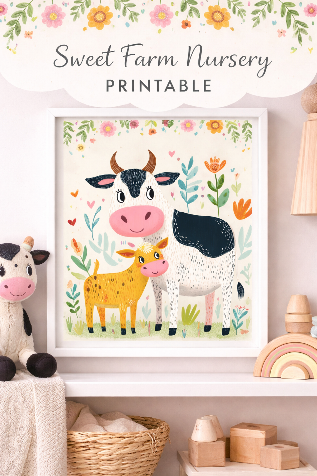 This sweet printable nursery wall art features a gentle mother cow standing beside her little calf, surrounded by playful flowers and cheerful garden details. The friendly expressions and soft illustration style create a warm, comforting scene perfect for a cozy nursery or baby room.