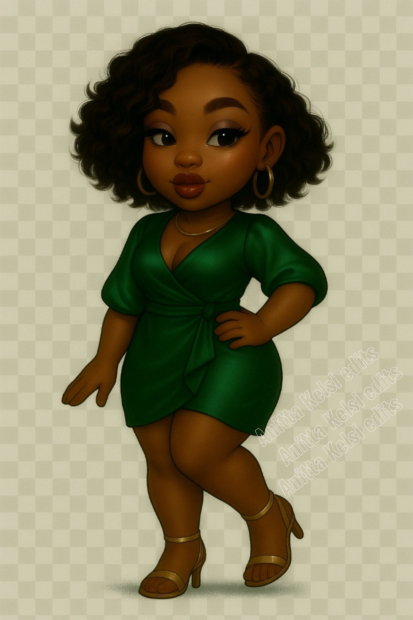 Step into bold elegance with this stunning curvy melanin chibi, wrapped in a chic emerald green dress and glowing with confidence. From her flawless makeup to her soft curls and golden heels, she’s serving pure style and grace! Perfect for fashion, beauty, or self-love themed projects. Delivered with a transparent background for easy use in your creative edits, prints, or digital content.