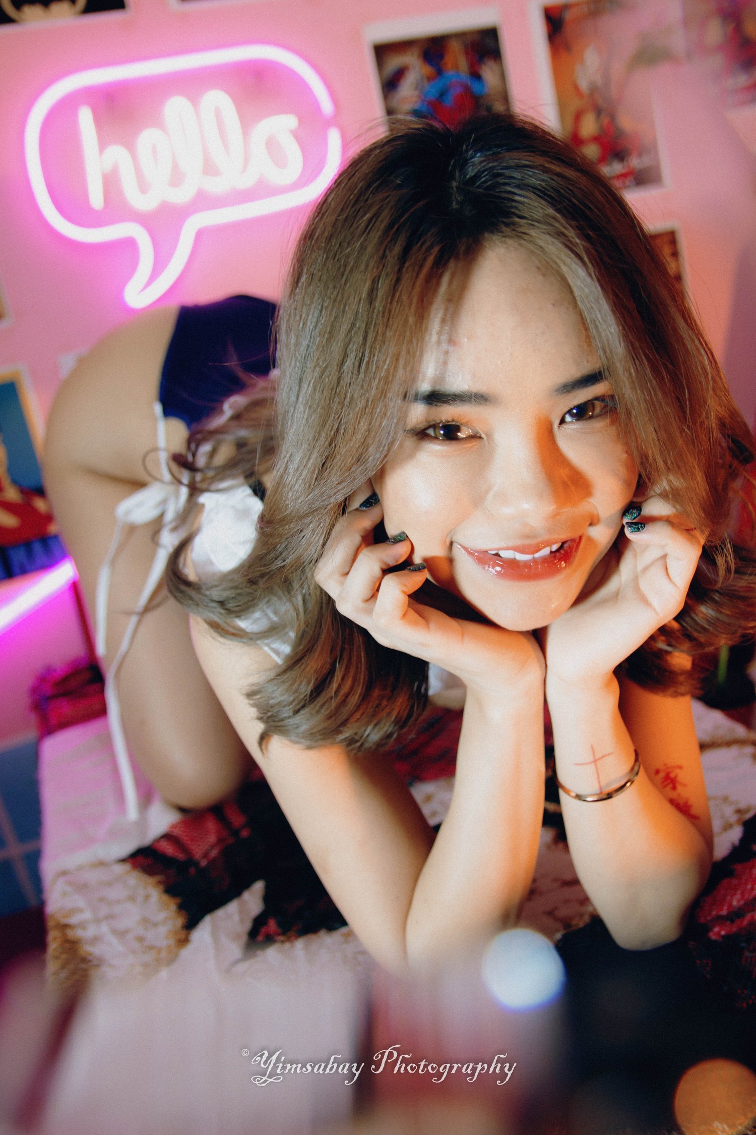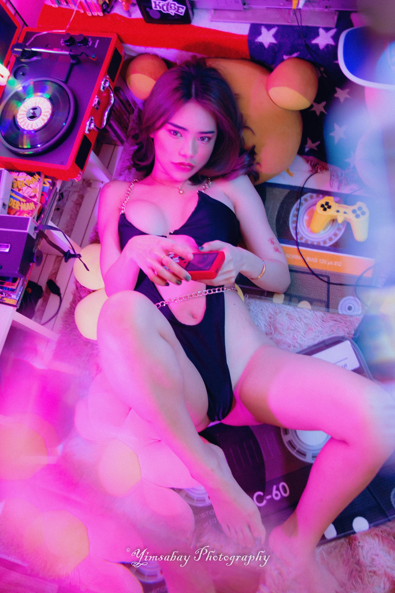 This album includes 246 photos, UNCENSORED. It includes white lace lingerie in warm light, one piece bikini with neon light, sexy maid outfit and classic black lace lingerie. No topless, no nude, but some shots are definitely risquรฉ.