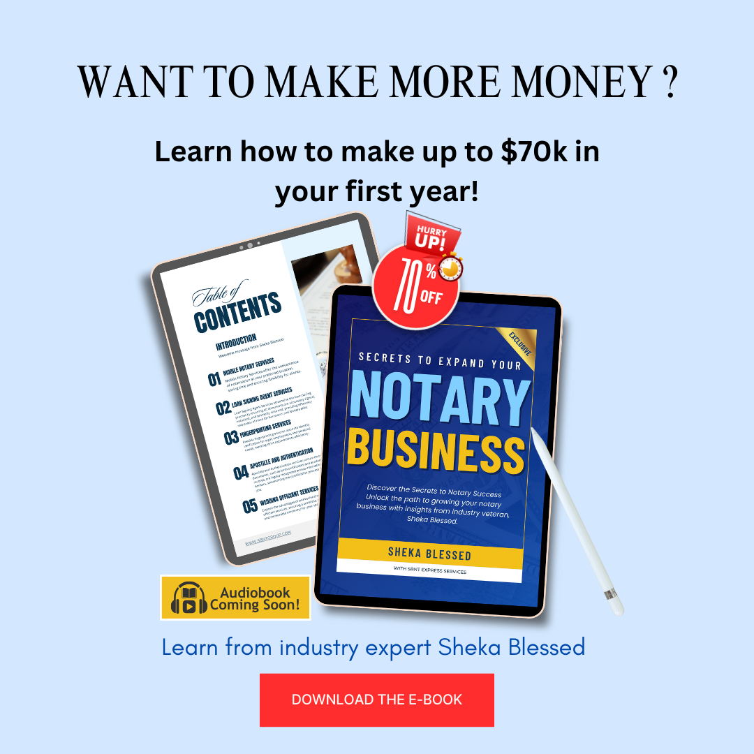 Purchase "Secrets to Expand Your Notary Business" today and get exclusive FREE access to master class webinar! Learn directly from industry expert Sheka Blessed and dive deeper into the strategies and techniques that will take your notary business to the next level.