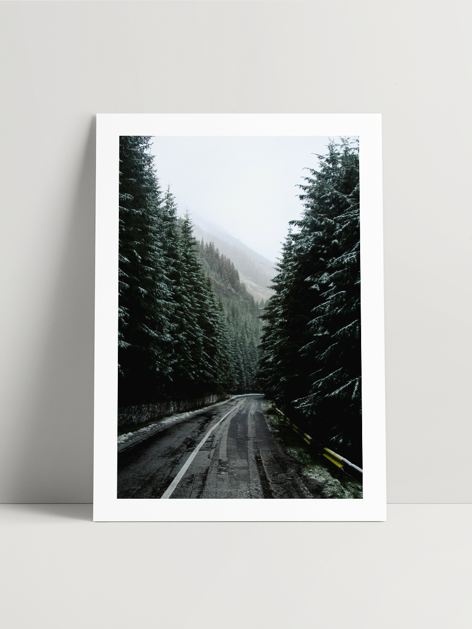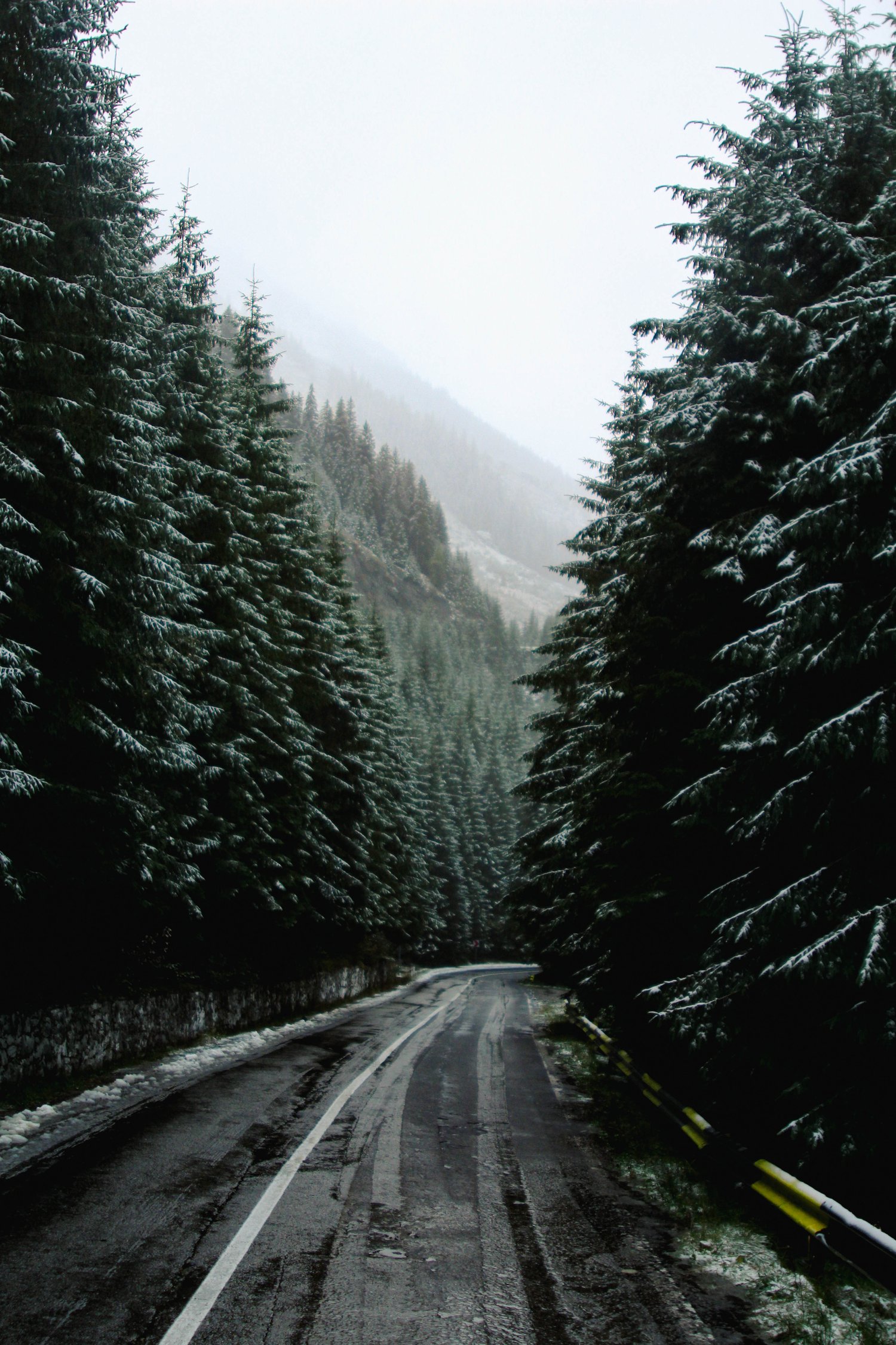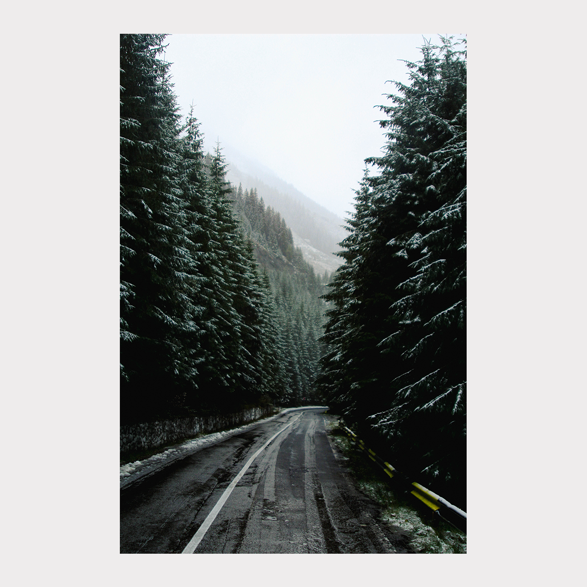 En redescendant la Transfăgărășan, la neige tombée le matin même avait transformé la forêt en un corridor silencieux. Les sapins, immenses et serrés les uns contre les autres, semblaient former un passage sacré où la route se frayait un chemin. Chaque branche portait une fine couche de neige, révélant la beauté du moindre détail. Je m’enfonçais seul dans cette forêt réputée pour ses ours, émerveillé par ce décor soudain blanc, par cette sensation de pénétrer dans un monde intact et préservé.