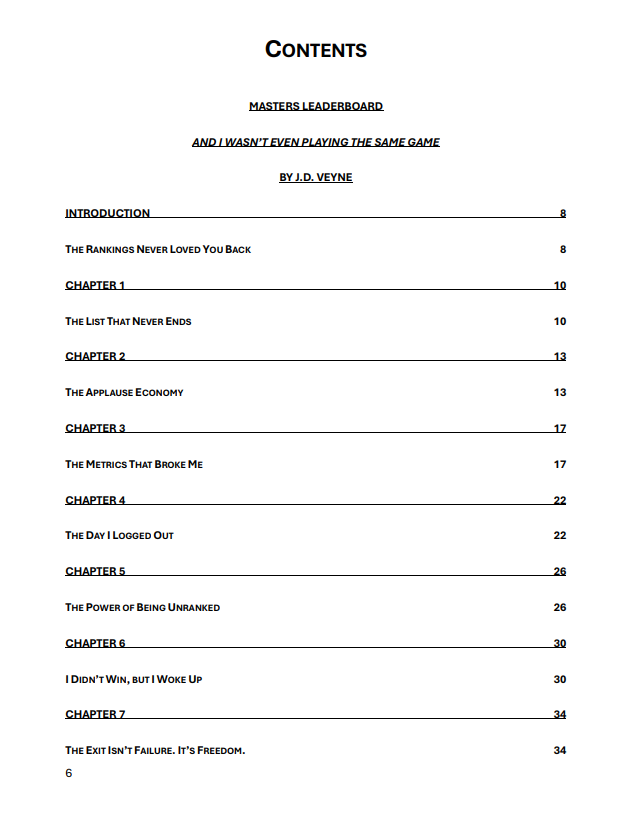 In Masters Leaderboard – And I Wasn’t Even Playing the Same Game, J.D. Veyne exposes the invisible systems that rank, score, and measure our lives—without ever asking for our consent.