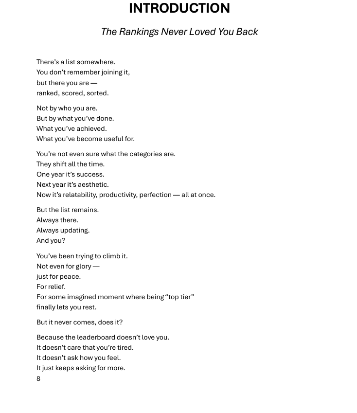 A guide for anyone tired of being a number, this book invites you to step away from the leaderboard and rediscover what was always yours: the right to live on your own terms.