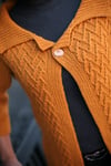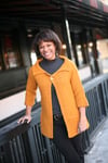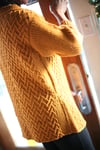 Note, the delicious Saffron colored yarn used in the sample sweater, O-wool Classic, is knit at a tighter than normal gauge. This produces a firm fabric that will wear well and be warmer, too!