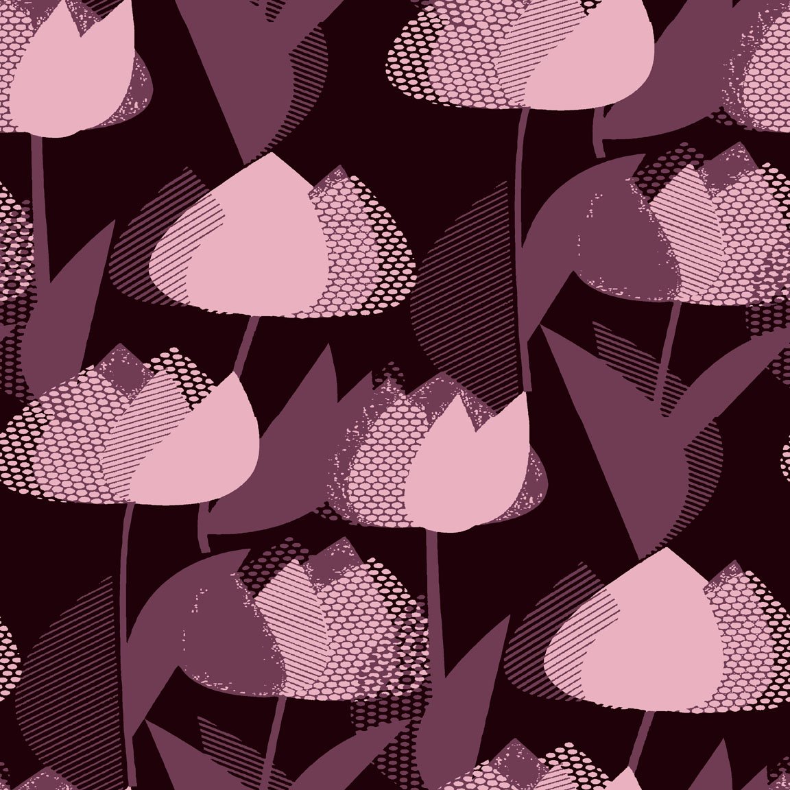 Stylized abstract tulip silhouettes featuring various geometric textures like dots and stripes on a deep burgundy background.