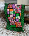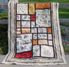 I first made this quilt using a panel with 2 large pictures and 2 smaller ones, those are the two fall-ish quilts. The light colored one has fat quarters for the large blocks. You can use a large scale print for the larger blocks and coordinating fabrics for the smaller rectangles. Or if you can find the right one, such as Jaftex' Safari Sights, a panel could work. You could also make it scrappy, using up coordinating “leftovers”!