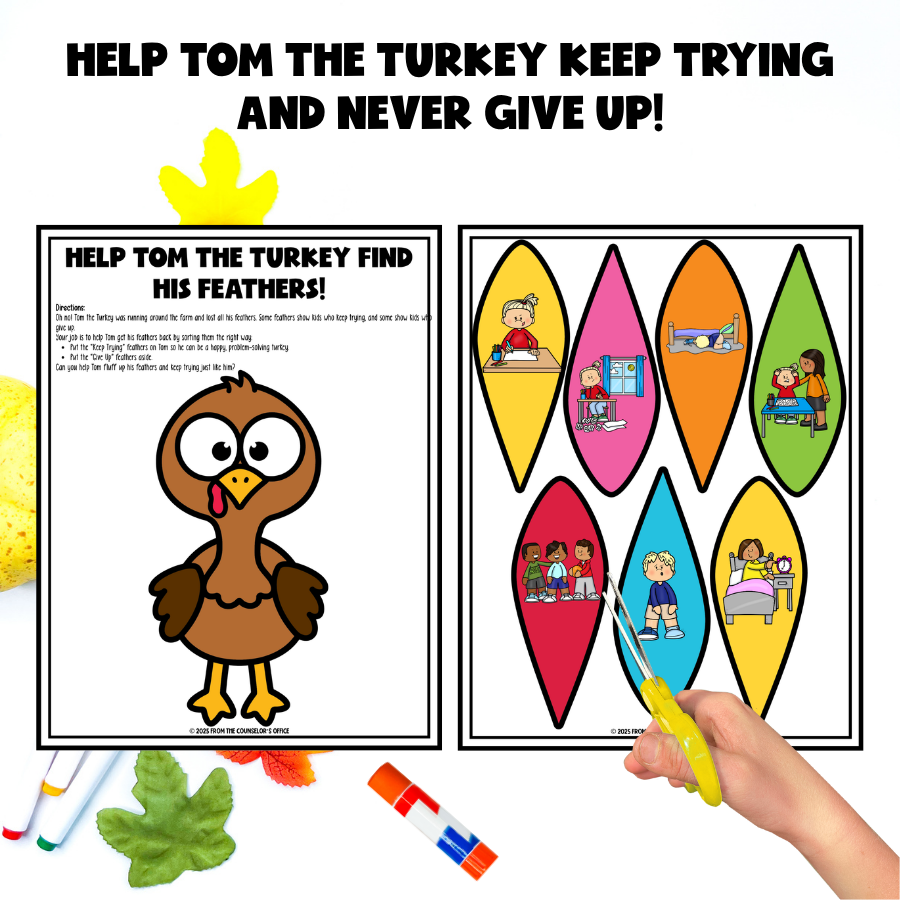 - Turkey Feather Sort – Students help Tom the Turkey find his “Keep Trying” feathers and sort out the “Give Up” ones.