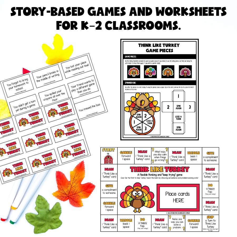 With story hooks, role-play, and engaging visuals, your students will love helping Tom the Turkey get his feathers back while practicing real-life “keep trying” skills.