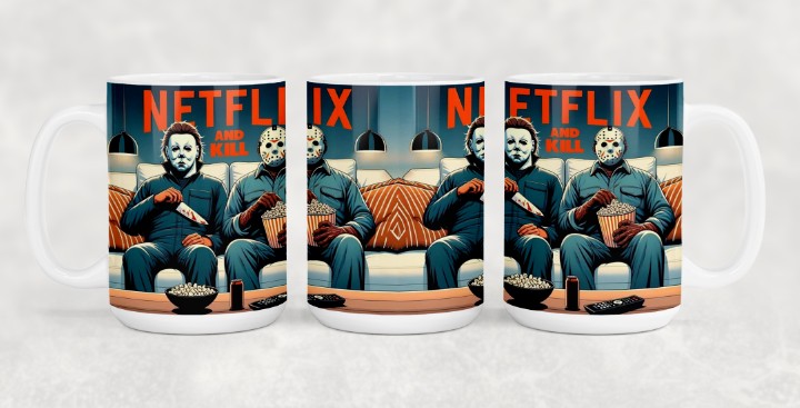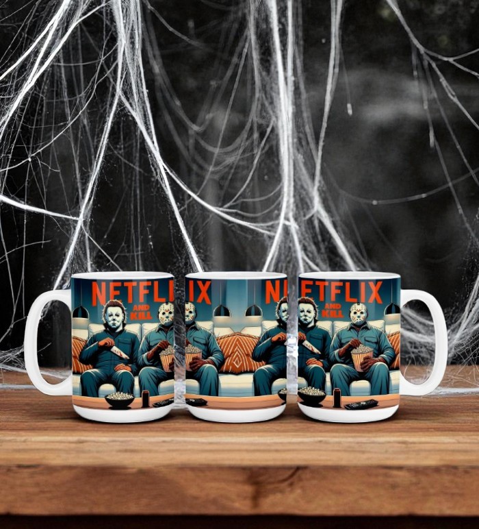 Forget “Netflix and chill”—this mug is for those who binge horror with popcorn in one hand and a scream in the other. Featuring iconic slashers Michael Myers and Jason Voorhees lounging on a couch in matching blue jumpsuits, this 15oz ceramic mug turns your morning brew into a full-blown fright fest. With bold red and yellow “Netflix and Kill” lettering and a cozy living room scene that’s anything but safe, it’s the perfect blend of creepy and comical.