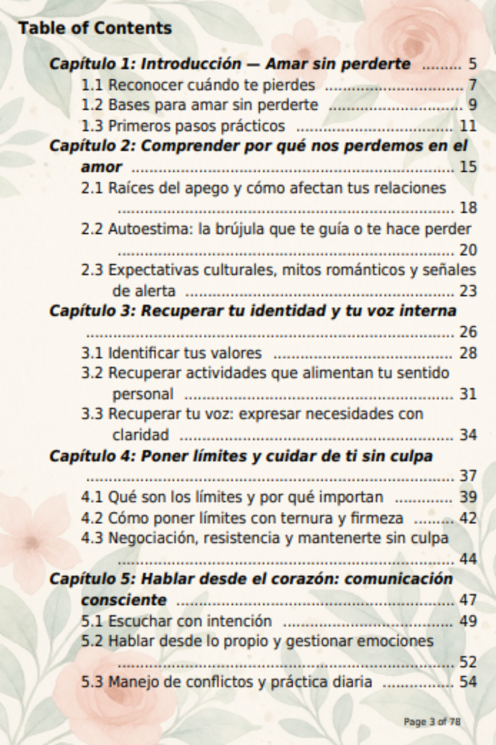 ¿Alguna vez te has sentido perdida en una relación, olvidando quién eres por amar demasiado? Este ebook es una guía emocional y práctica para reconectarte contigo misma, sanar heridas del pasado y aprender a amar con conciencia, sin culpa y sin perder tu esencia. A través de reflexiones, ejercicios y estrategias basadas en psicología y crecimiento personal, descubrirás cómo fortalecer tu autoestima, poner límites sanos y construir vínculos desde la libertad y el respeto.