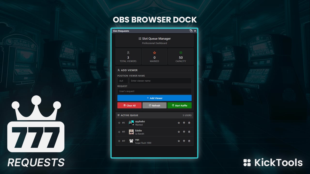 Organize your stream and boost engagement with Requests, the all-in-one queue and raffle widget made for Kick. Easily manage viewer slots, game queues, or requests—plus add excitement with real slot machine animations for raffles.