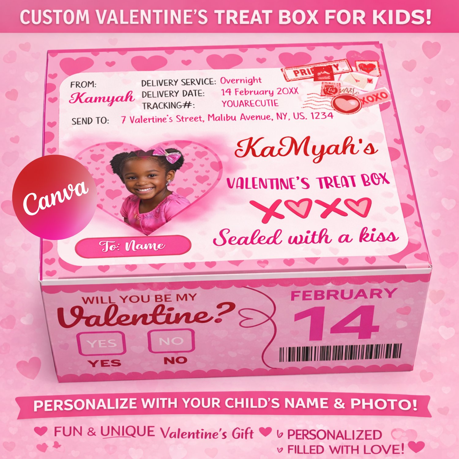 This adorable Valentine-themed box is personalized with your child’s name and photo, making it a fun and memorable keepsake.