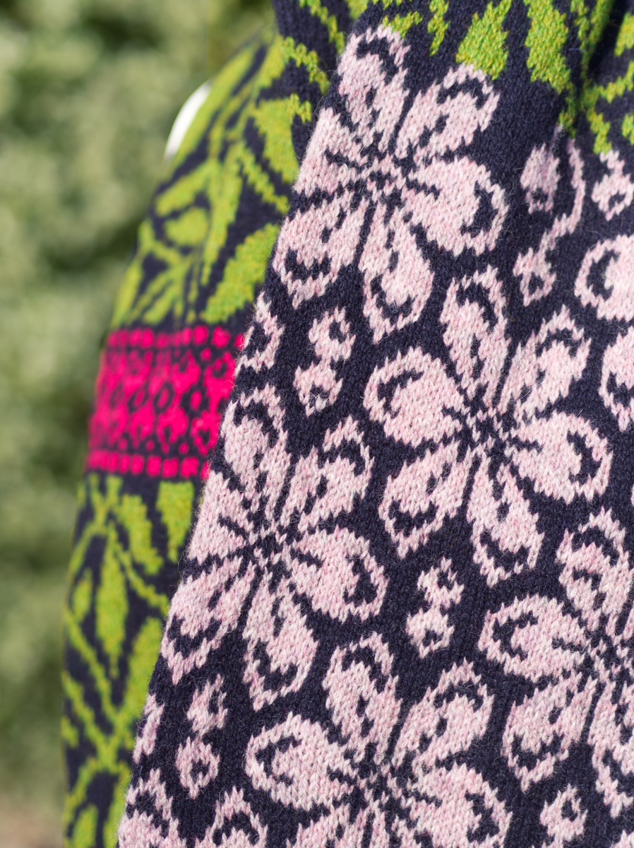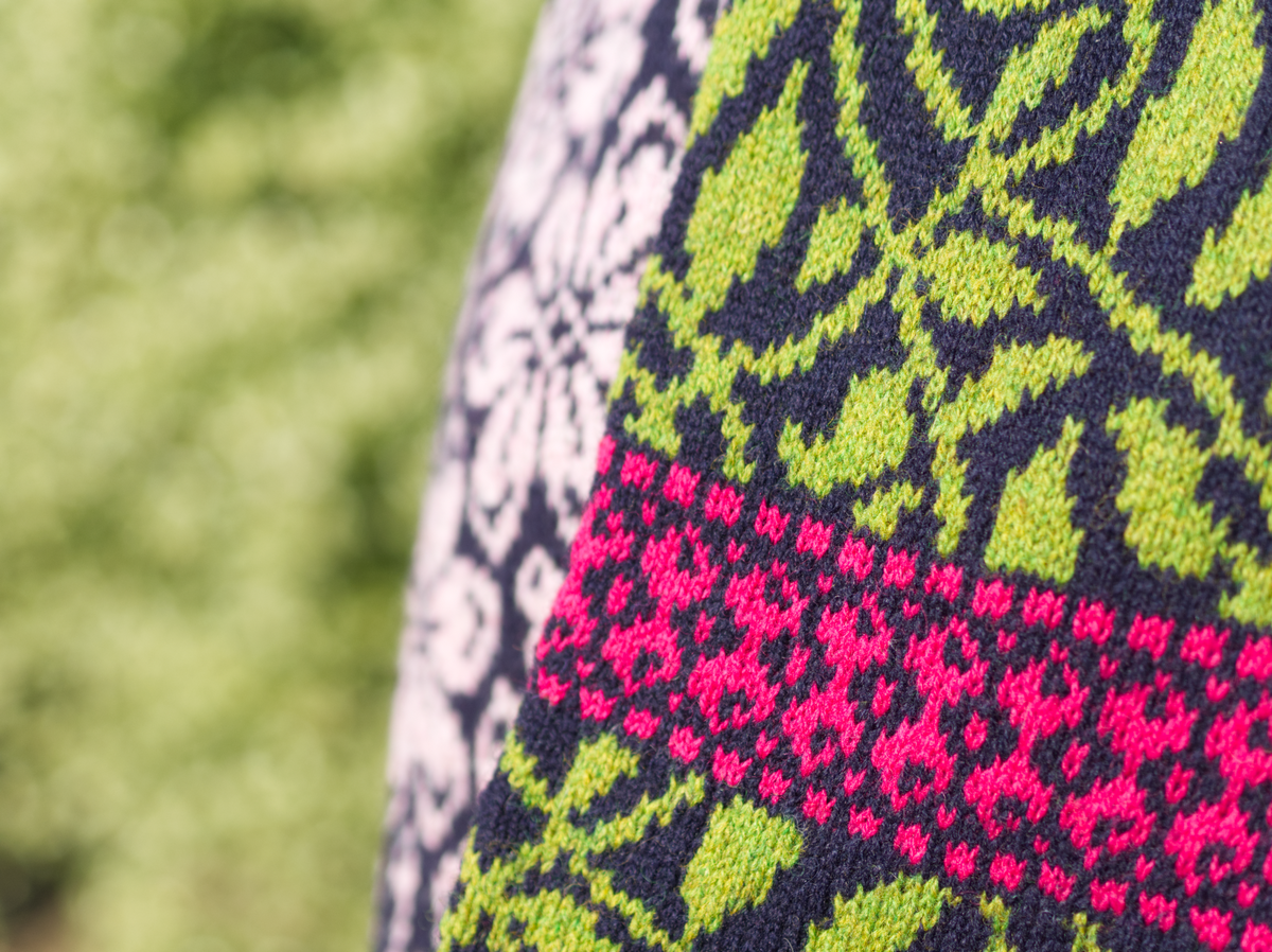 26 stitches by 31 rounds = 10cm [4”] in stranded leaf chart.