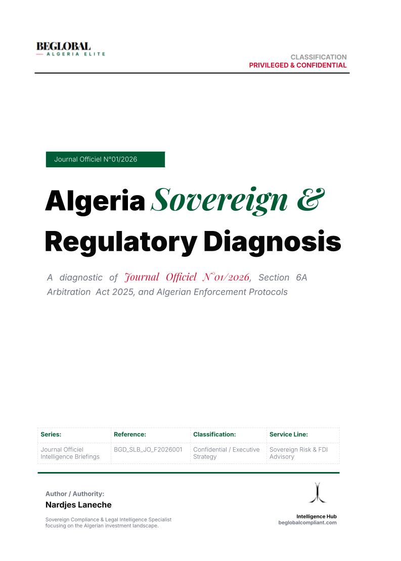 A high-impact diagnostic of Journal Officiel N° 01/2026. This briefing moves beyond simple translation to decode sovereign intent and enforcement protocols within the Algerian market. We specifically analyze the implementation of the Arbitration Act 2025 and its intersection with current FDI stability mandates.