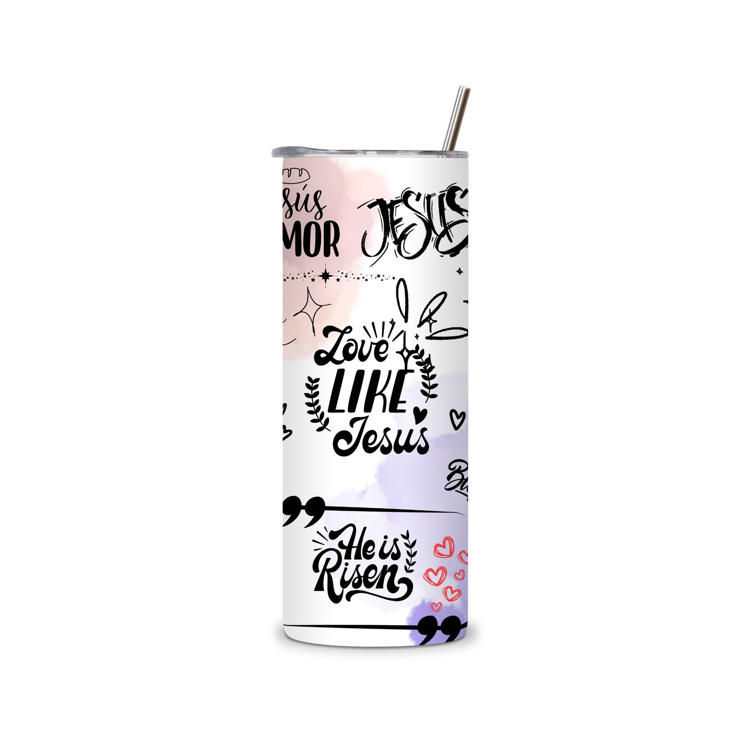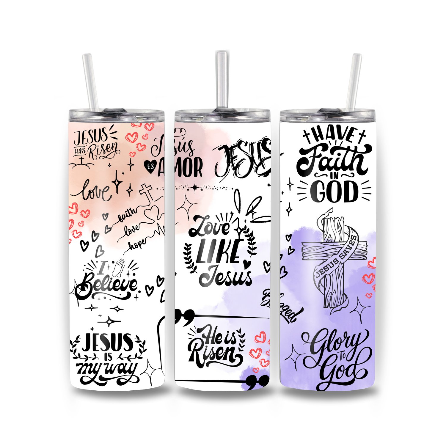 Celebrate your faith daily with this Christian Pastel 20 oz Skinny Tumbler, beautifully designed with uplifting phrases like Love Like Jesus, Have Faith in God, Jesus Saves, He Is Risen, and I Believe. Soft pink, lilac, and peach watercolor tones bring a warm, inspiring look to your drinkware — perfect for church, work, Bible study, or gifting to someone special.