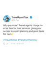 - "Why pay more? Travel Agents charge no extra fees for their services, giving you access to expert planning and great deals for free! 🌴✨ #TravelPlanning #NoExtraFees"