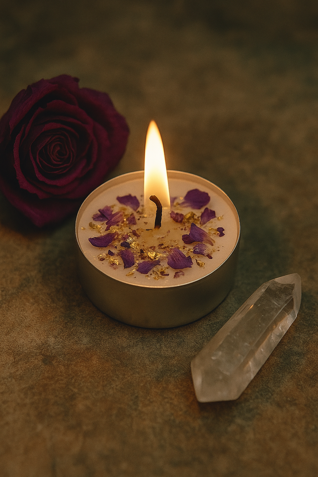 This tea light is charged with glamour herbs and enchantment to boost confidence, beauty, charm, and magnetic presence—energetically and visually.
