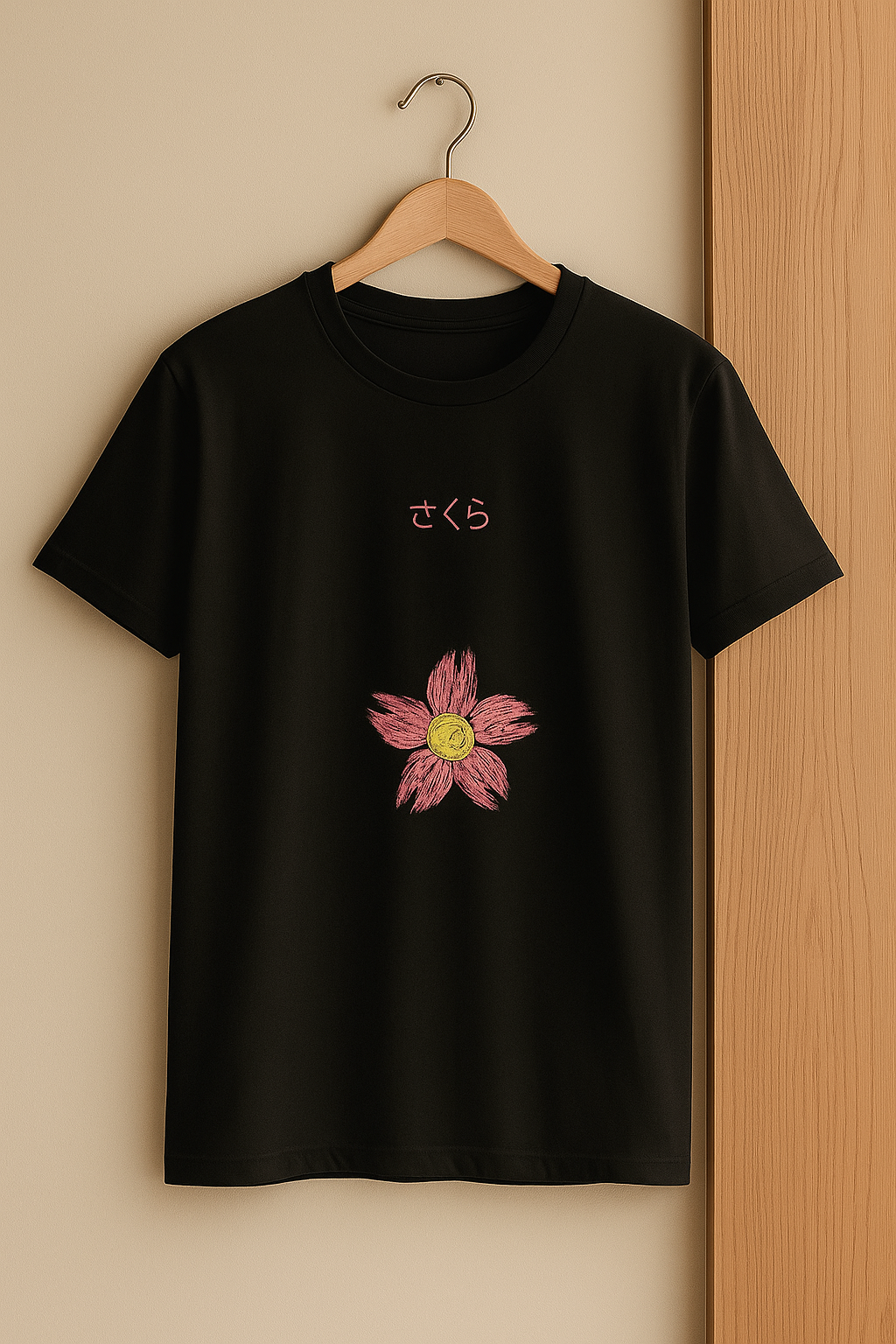 This premium black unisex T-shirt features a soft pink Sakura (さくら) flower print – a symbol of friendship, beauty, and new beginnings.