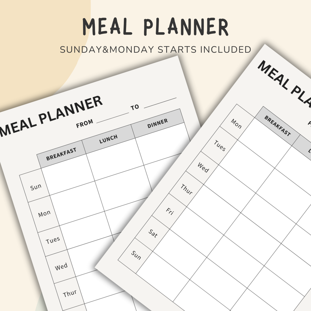 Printable Meal Planner | Sunday&Monday Starts | Instant Download PDF | A4