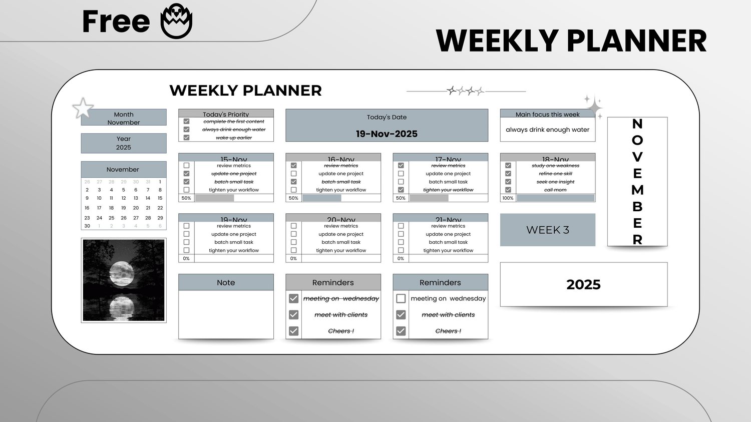 📅 Weekly planner designed to structure your days at a glance.