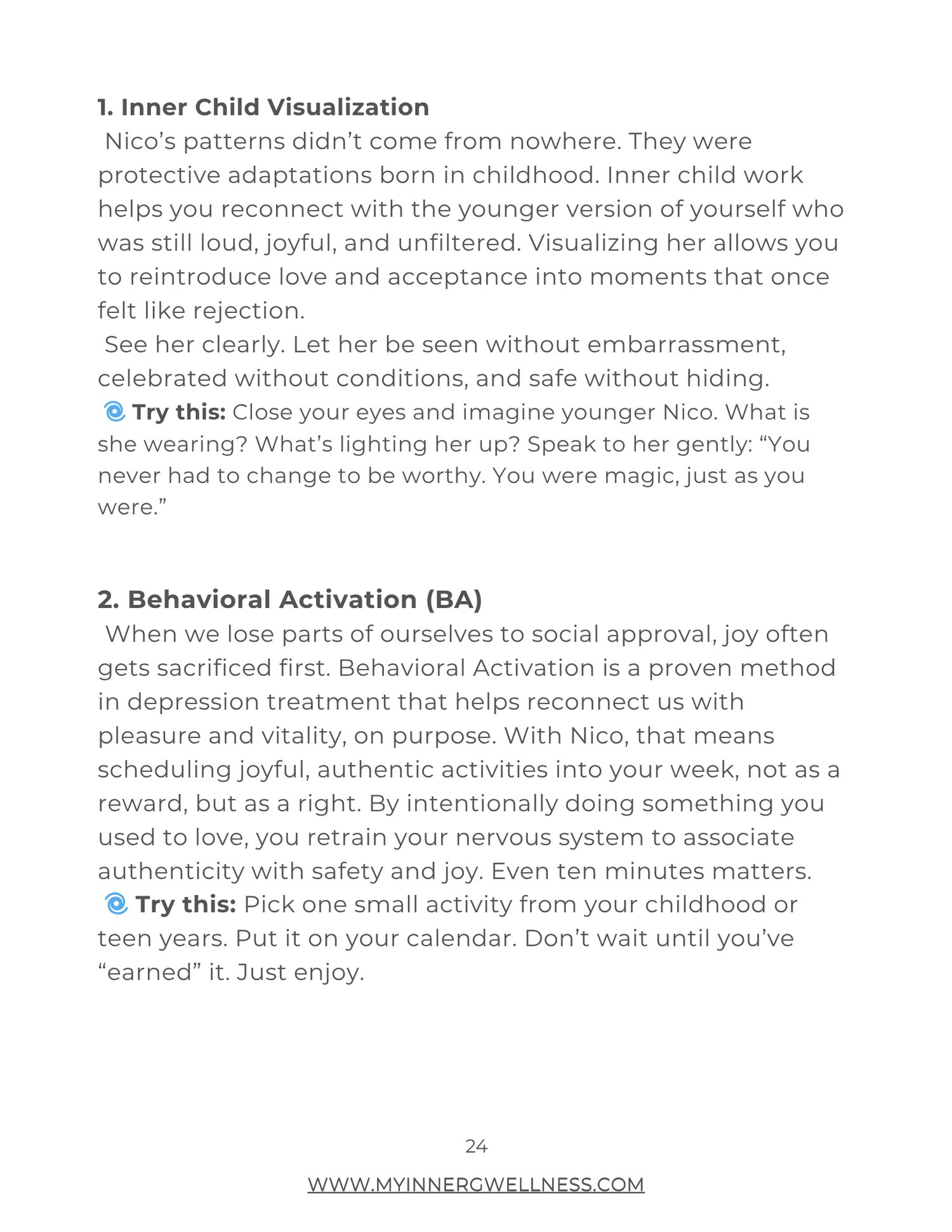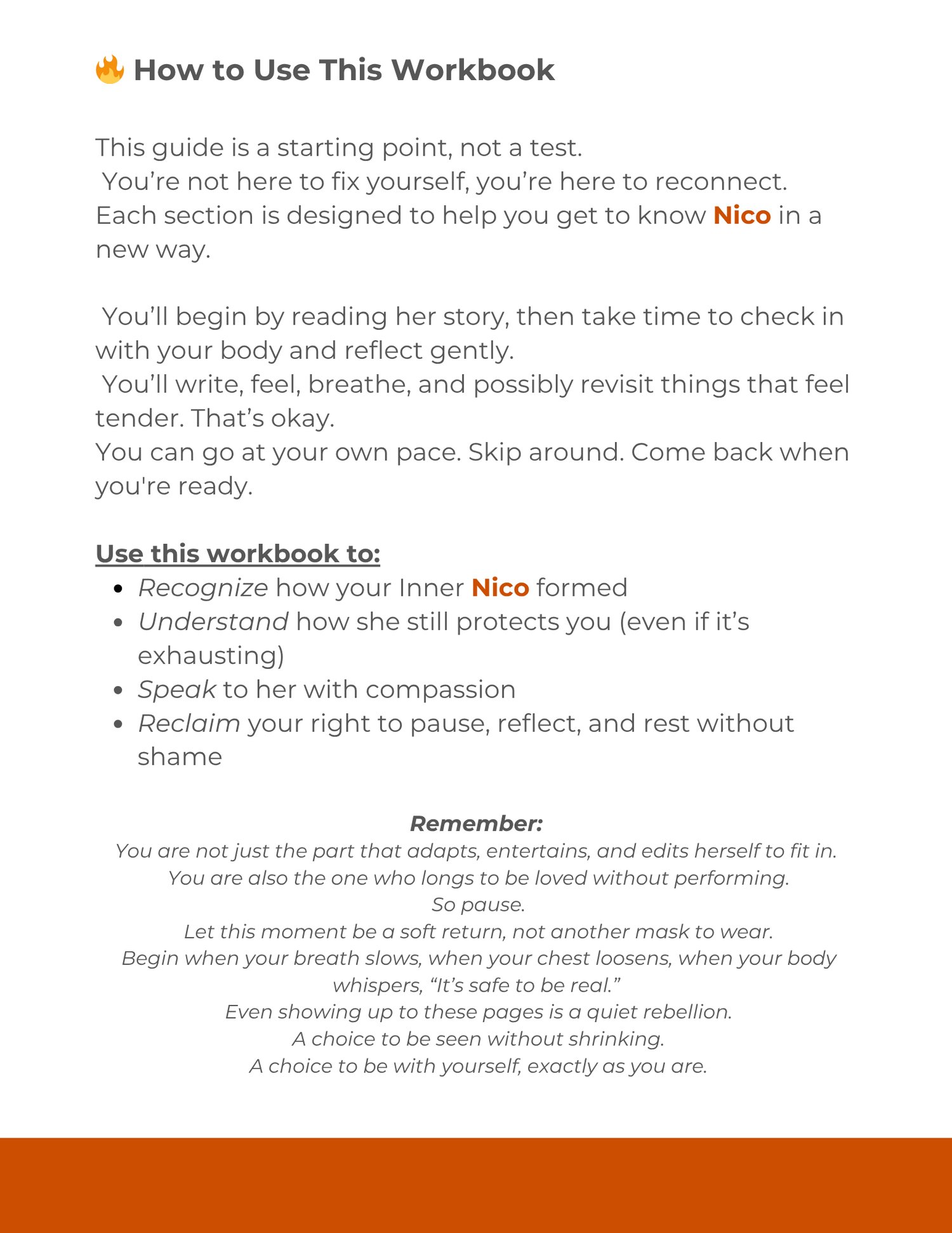 Meet Your Inner Nico is a powerful, 20+ page digital workbook designed for people who’ve spent years adapting, pleasing, and performing just to belong. If you’ve ever silenced your joy, hidden your weirdness, or edited yourself to be more “likable,” this guide was made for you.