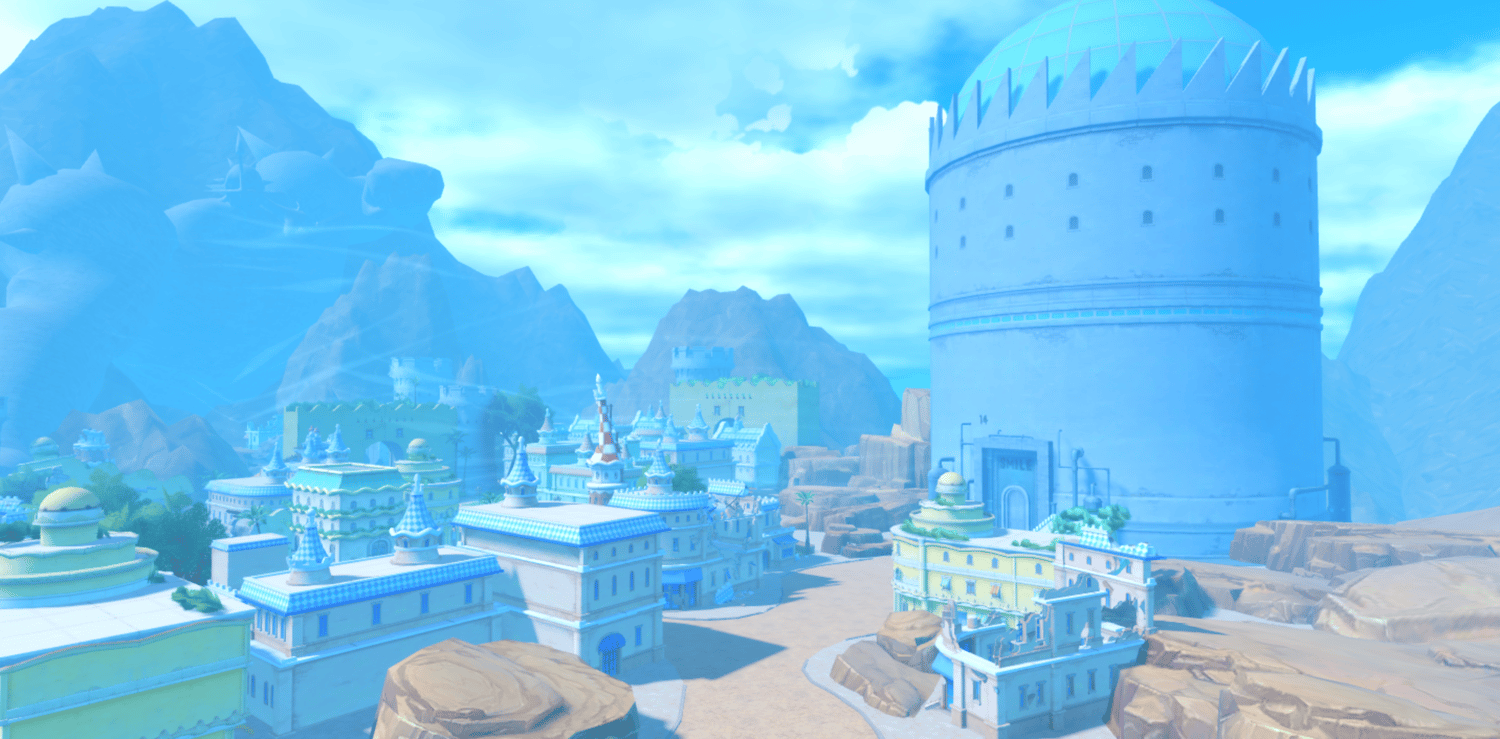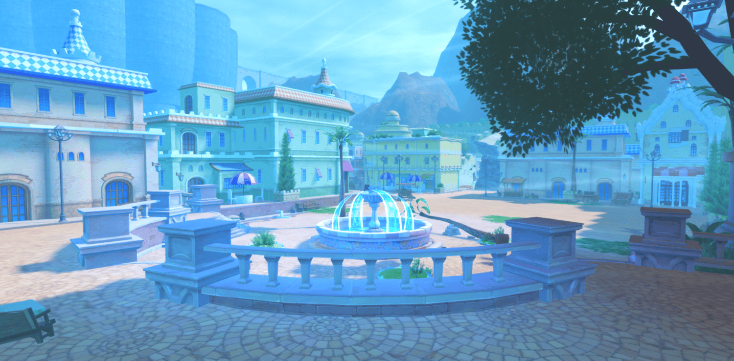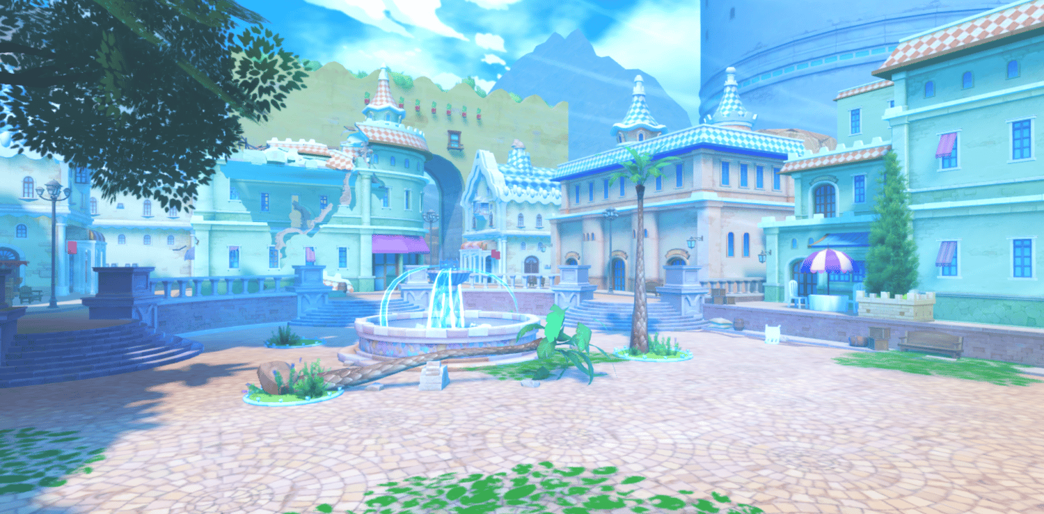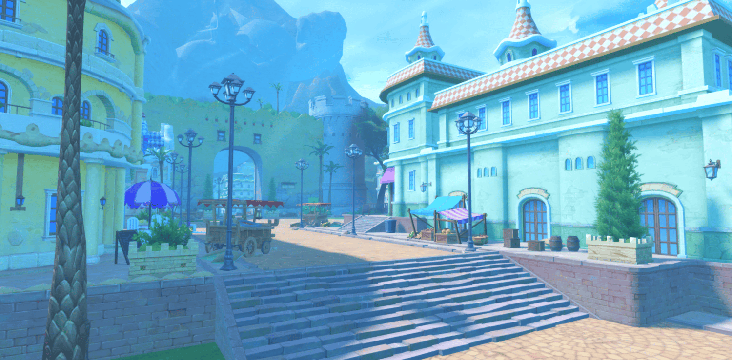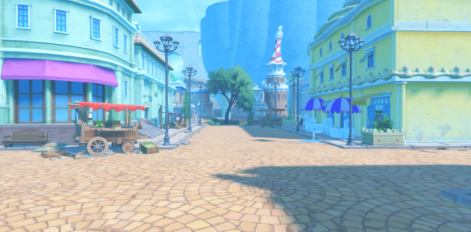 A vibrant anime-inspired recreation of Dressrosa from One Piece, featuring colorful Mediterranean architecture with pastel-colored buildings, cobblestone streets, and lively town plazas with fountains. Towering castle walls, domed structures, and European-style storefronts capture the Spanish-influenced kingdom's charm. Lush green trees, warm sunlight, and soft atmospheric haze create a cheerful adventurous tone true to the series. Wide open streets and scenic overlooks support smooth exploration across the sprawling city. Perfect for One Piece fan games, anime RPGs, adventure experiences, roleplay worlds, or cinematic showcases.