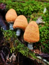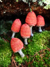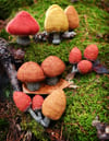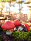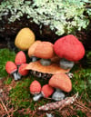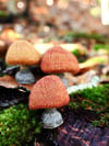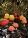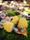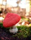 Each mushroom fits in the palm of your hand and takes only a few hours to knit. The knitting is mostly stockinette worked in the round with just a few carefully placed increases and decreases to give it shape.