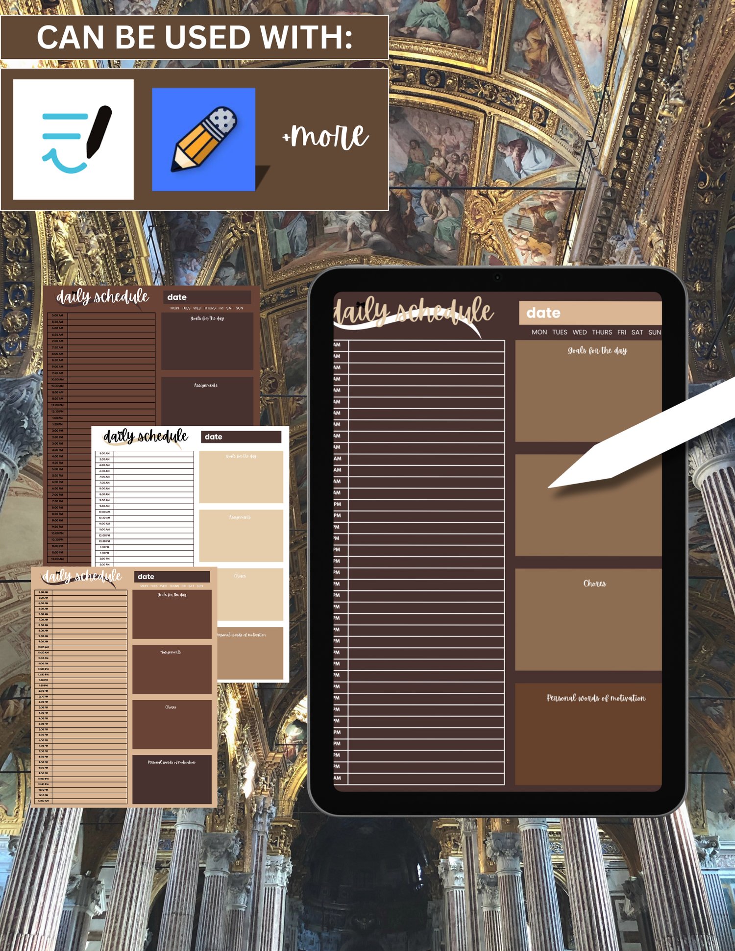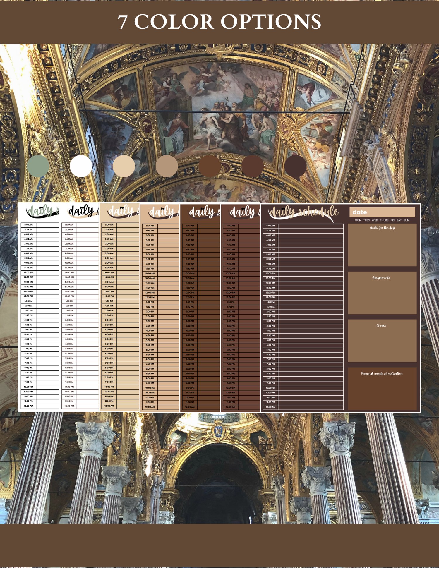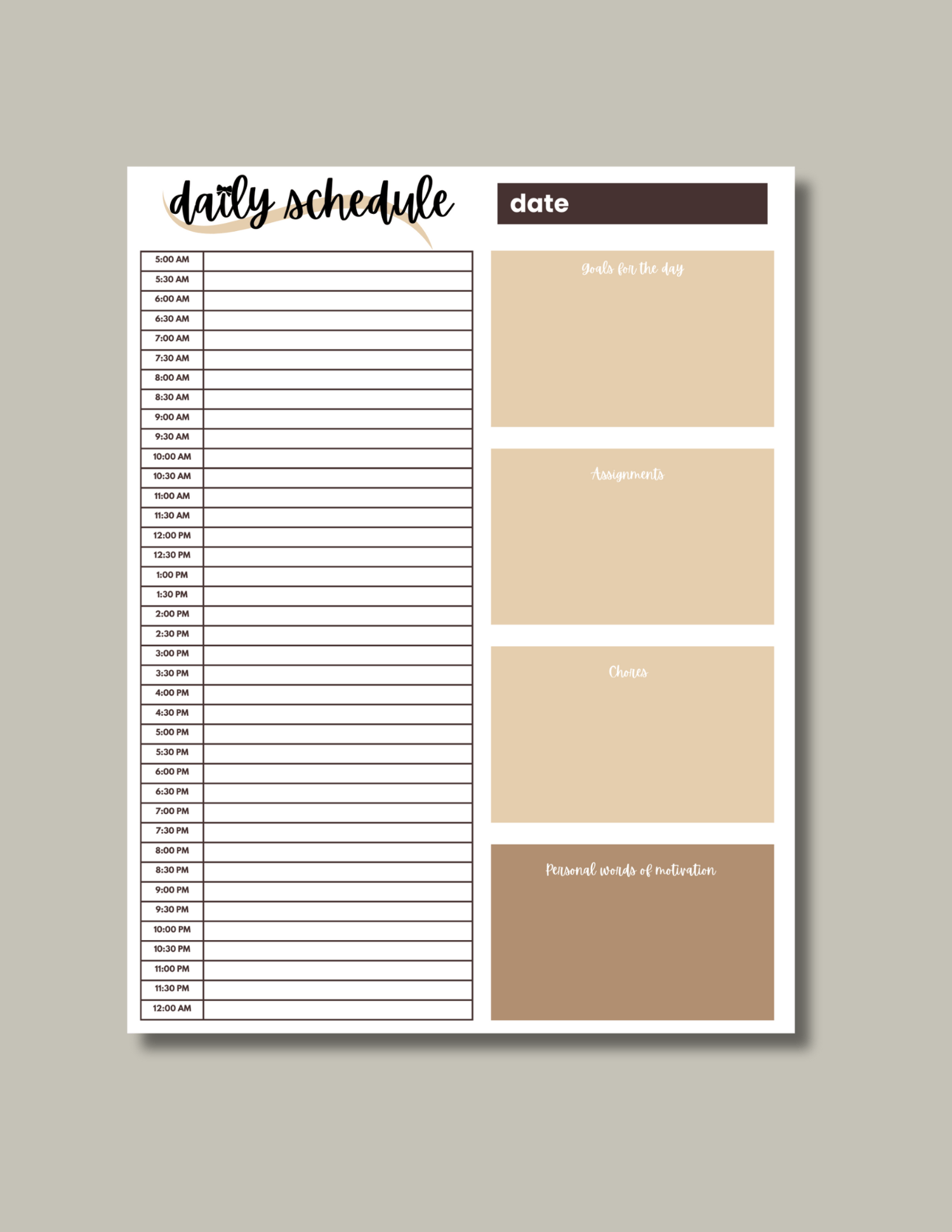 Plan out your day with this digital daily schedule template. Know what you're doing from 5AM-12AM and manage things like your classes, goals for the day, and even give yourself some words of affirmation.