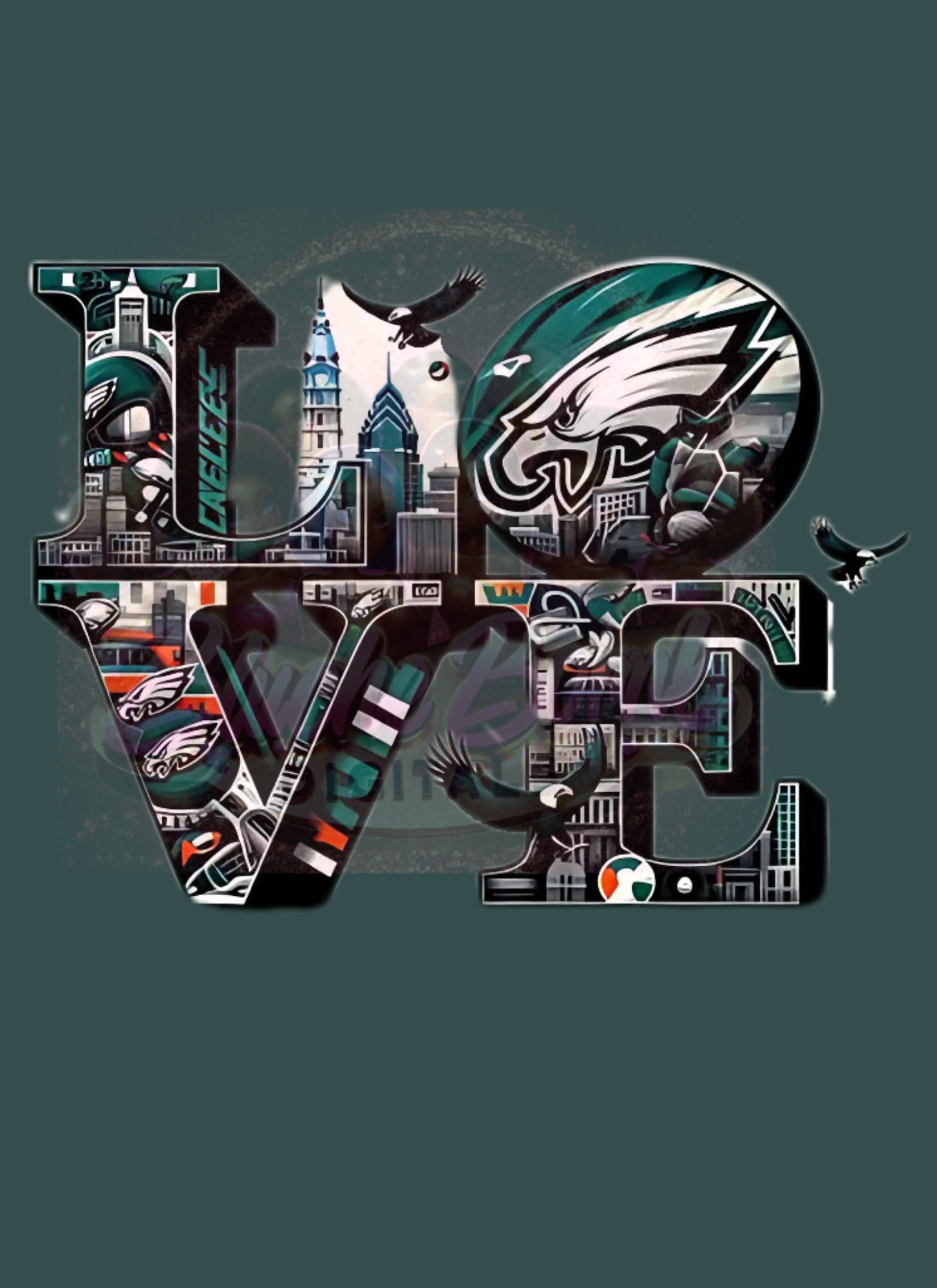 Celebrate your love for football and the PA Eagles with this stunning digital PNG design! Featuring the word "LOVE" intricately crafted with iconic PA landmarks, football elements, and the Eagles logo, this artwork is perfect for fans who bleed Green and Black. A creative blend of PA pride and team spirit, this design is versatile for a wide range of projects.
