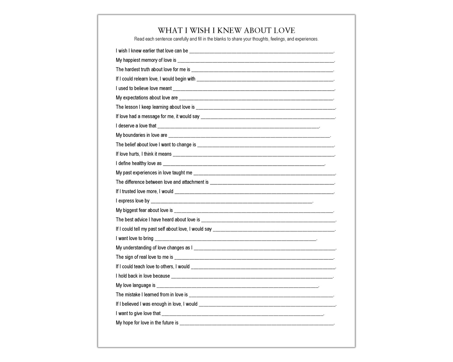 Healing isn't about forgetting the past, but about understanding it well enough to build a better future. This What I Wish I Knew About Love worksheet features 30 prompts to help you slow down and reflect on the lessons you gain with hindsight. Use it for therapy sessions, journaling, or self-reflection to celebrate how far you’ve come and how much you’ve learned. Trusting yourself is the first step toward a love that lasts.