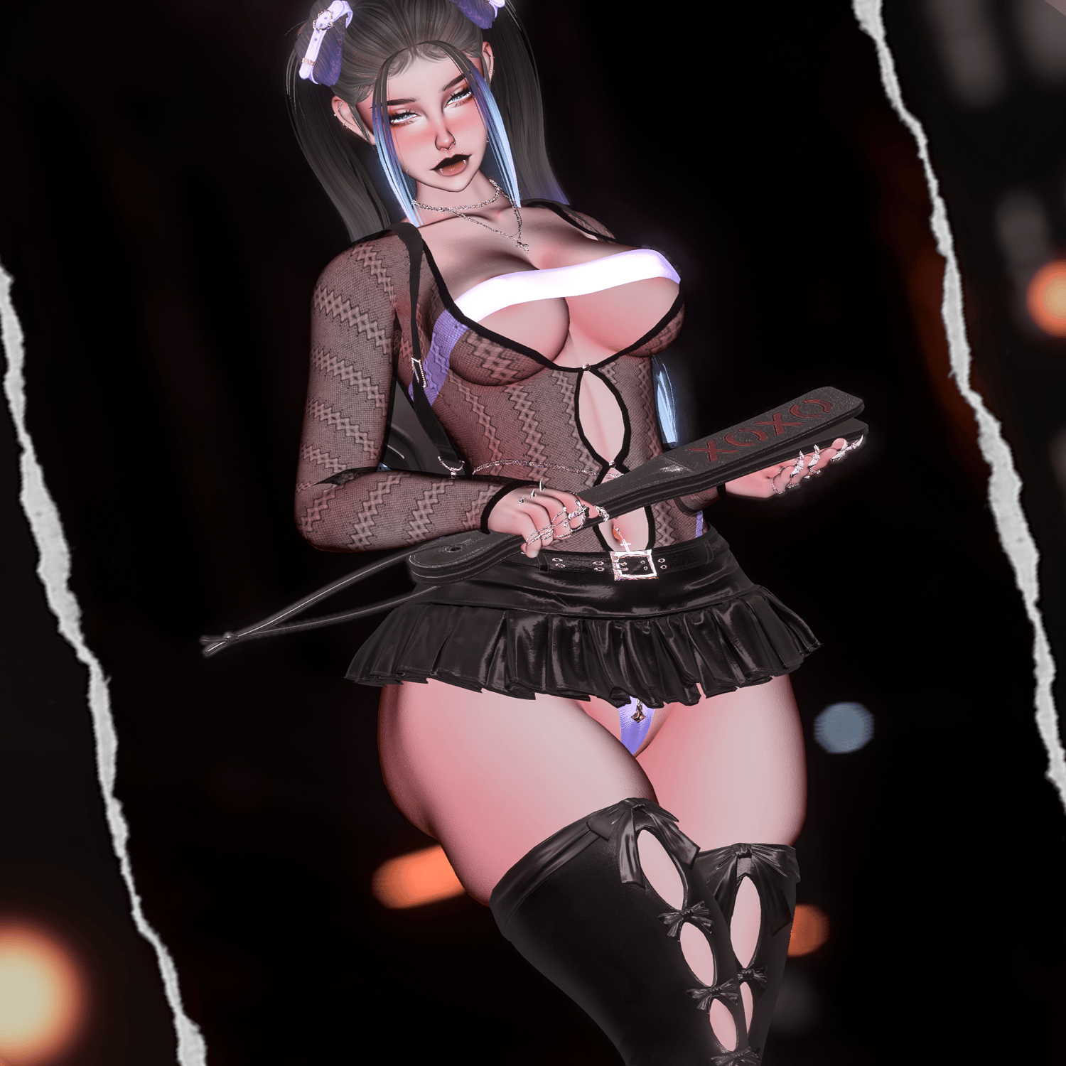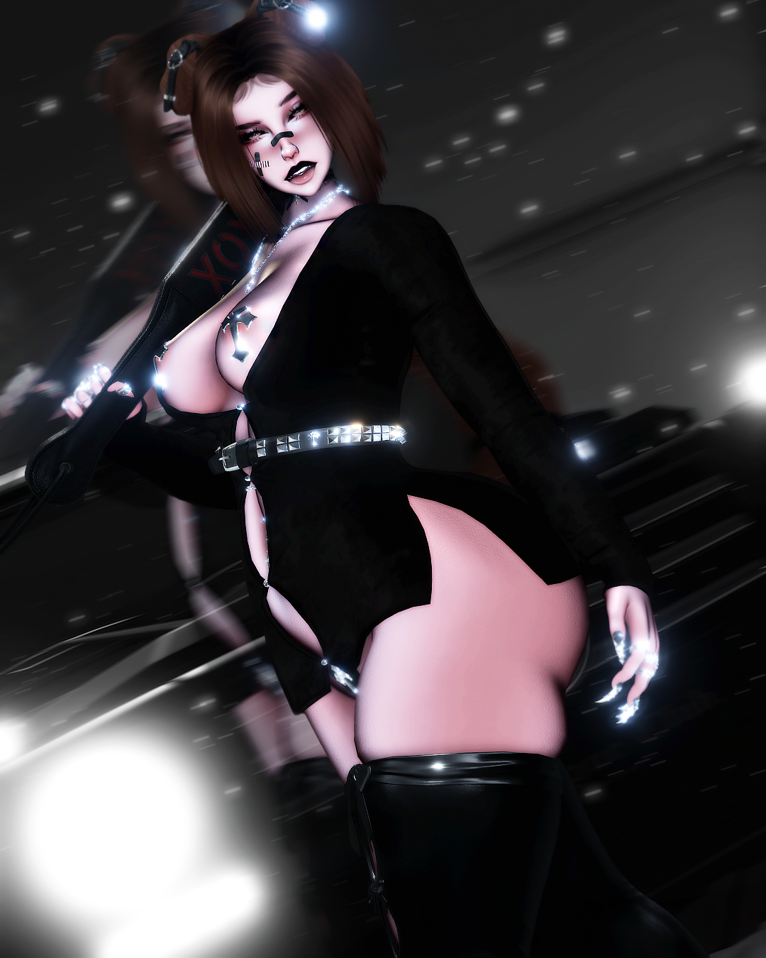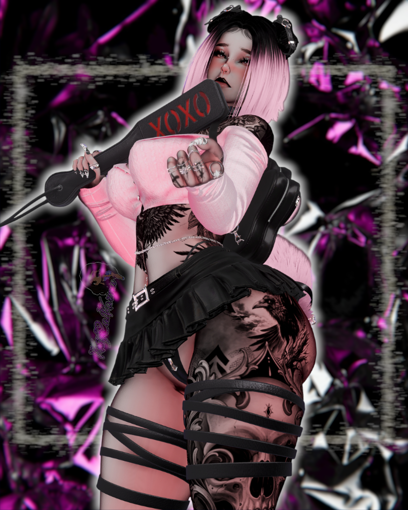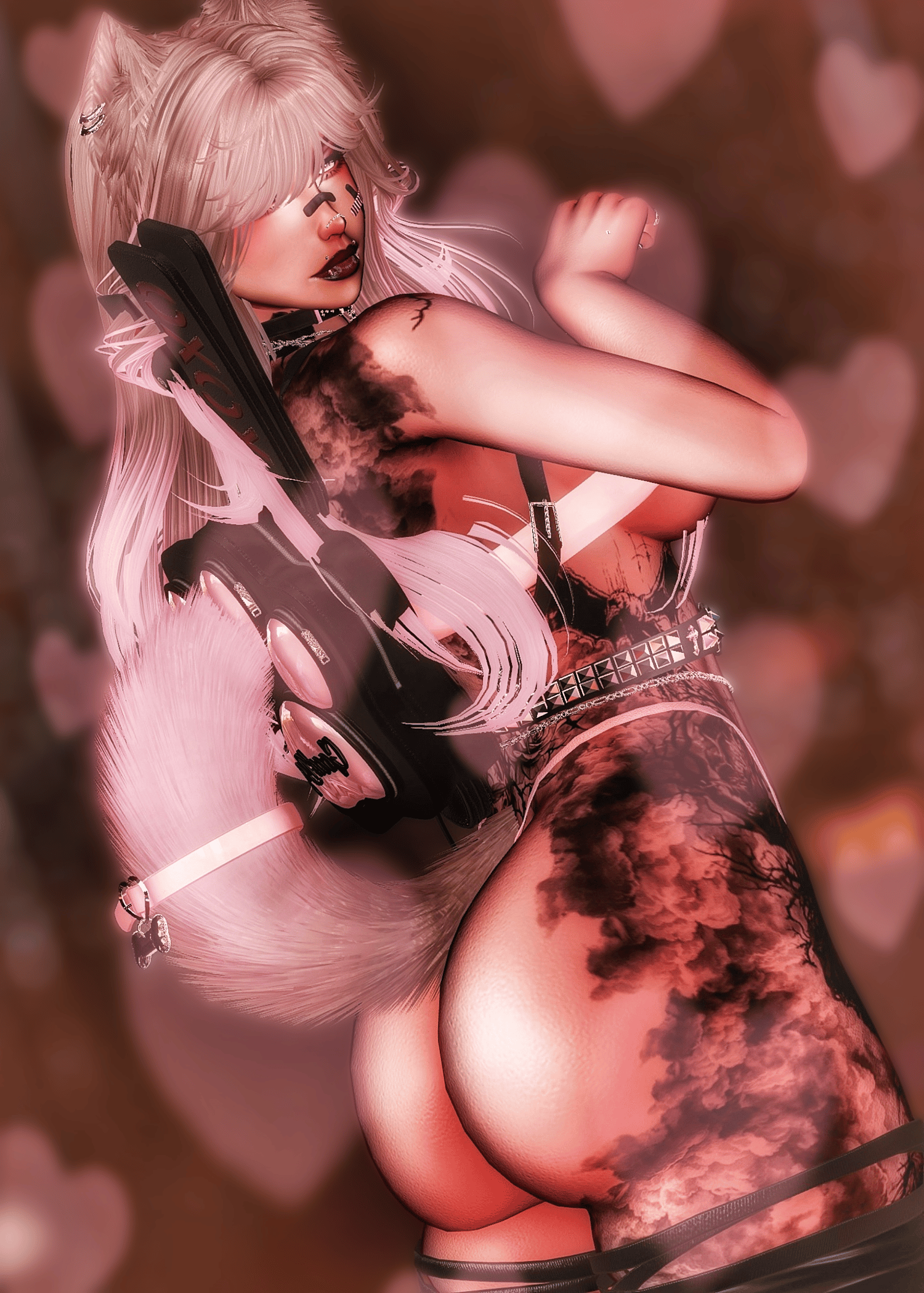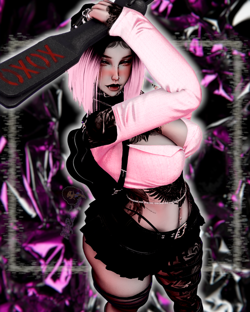 Body/Pants - zinpia(my edit no reuse), Babyhairs/Long sleeve top - sleepyvrc, Eye Texture - fair, Backpack/Hair Textures/Wavy Hair/Boots/Skirt - saikura, Bandaids- berryvee, Head/Makeup/Pigtail hair/Short hair/Belt/Bikini top & bottoms/Husky ears/Pasties - nessy.store, Bodysuit/Hip Chain - weeby, Stockings/Heels/Cross Choker - mariaaam, Necklaces -suki, Lace Choker - wolvesstudio, Puppy Tail & Ears/Collar - winks, Braid Pigtails - minki, Strap top/Leg ribbons - mutt, Paddle & Whip - holoexe, Nails/Rings - nauuki, Tattoo 1 - yamikitty, Tattoo 2 - francetexture, Rerig Com - yuuji(my edit, no reuse), Unity Com/FT Set up - littlelilith, Heart Particles - bunky, Gogoloco - franada, Misc - wholesome, Neck Merge - Crozzie