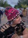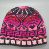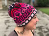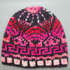 This stranded hat was inspired by Aphrodite, Greek goddess of love and beauty. The festive design is full of symbols often linked with love, beauty and nature; boxed windows, columns, meanders and the Greek key on the bottom section symbolizing the beauty of landscape and architecture. Then the design continues to scallops harboring a heart symbol, fireworks coming from a house, leaping to the sun.