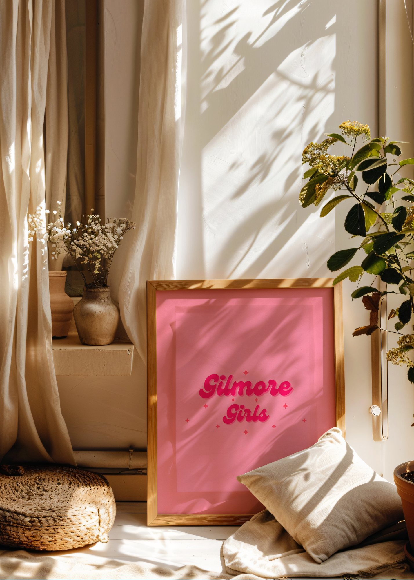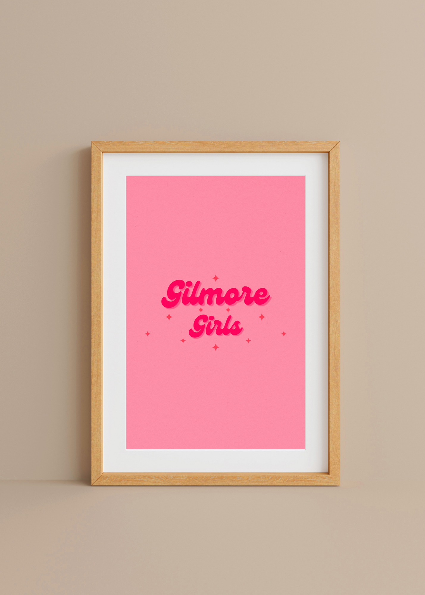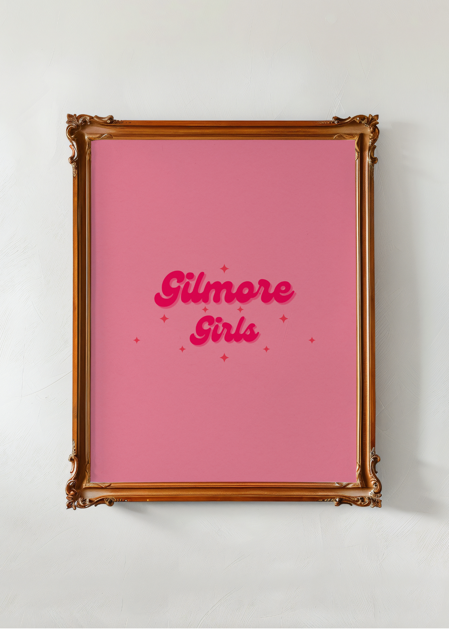 Gilmore Girls, Pink— A playful nod to a beloved world, this original piece brings the spirit of Gilmore Girls to life in a burst of color and charm. Set against a bright, cheerful backdrop, the iconic words shine in a fun, modern font—simple, bold, and full of heart. Whether it evokes cozy nights, fast-talking scenes, or small-town magic, this design offers a vibrant tribute to the stories we return to again and again. Available in a variety of joyful hues to suit every mood.