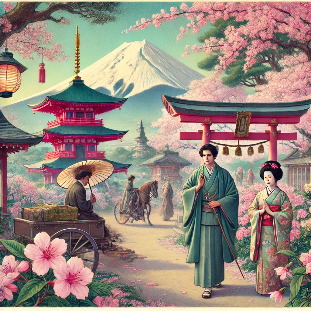 This scene beautifully captures the elegance and mystique of Japan during the era of global exploration, reflecting the moment when Phileas Fogg and his loyal companion Passepartout make a brief stop in Japan before continuing their daring journey across the Pacific.