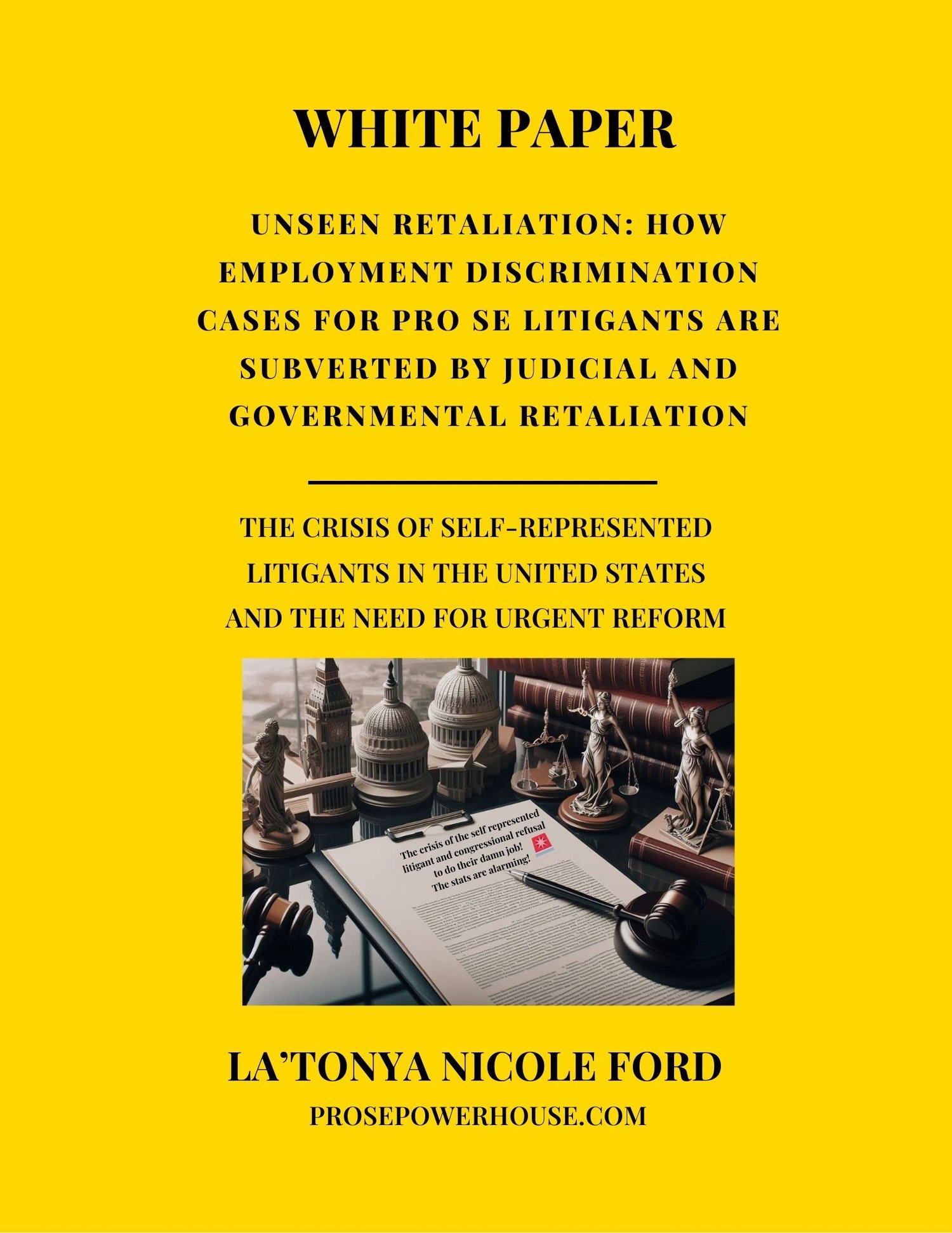 Unseen Retaliation exposes the profound systemic flaws within the U.S. legal system that deprive individuals seeking justice in employment discrimination cases of a fair and transparent process. Through the lens of La'Tonya Nicole Ford’s ongoing legal battle, this white paper uncovers the deep injustices faced by pro se litigants—individuals forced to navigate the complex and often biased legal system without legal representation. Ford’s case, marked by a relentless campaign of retaliation, harassment, and judicial misconduct, highlights the stark realities that many plaintiffs face when challenging systemic wrongs.