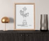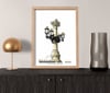 Ilustración de una farola antigua del Retiro, con detalles decorativos de flores, brazo curvo y lámpara de cristal. Trazos sencillos capturan su diseño clásico y ornamentación característica.