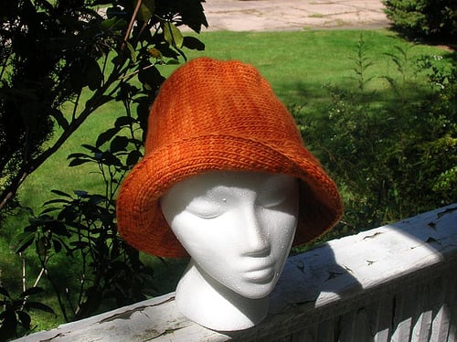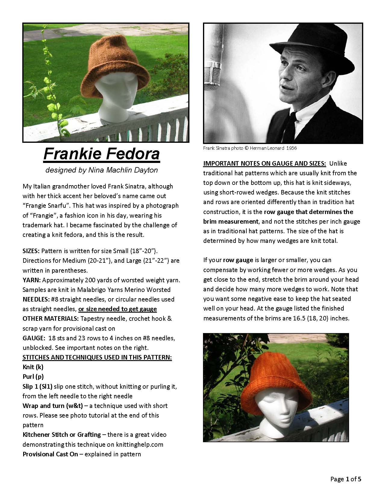 My Italian grandmother loved Frank Sinatra, although with her thick accent her beloved’s name came out “Frangie Snarfu”. This hat was inspired by a photograph of “Frangie”, a fashion icon in his day, wearing his trademark hat tilted to the side, looking stylin’. I became fascinated by the challenge of creating a knit fedora, and this is the result.