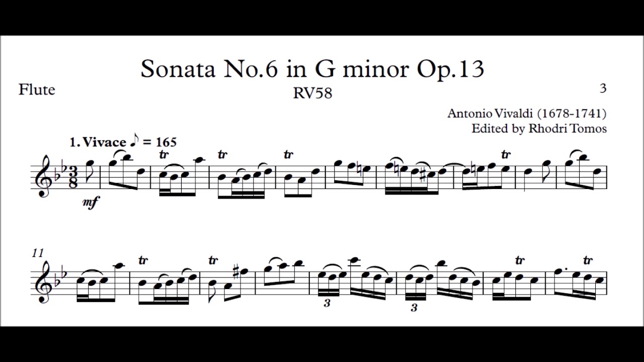Vivaldi RV58 Sonata in G minor - sheet music and play along accompaniment. Sheet music pdf for violin or flute, piccolo trumpet in Bb, soprano cornet in Eb and trumpet in Bb. Play along accompaniment mp3 to all four movements: