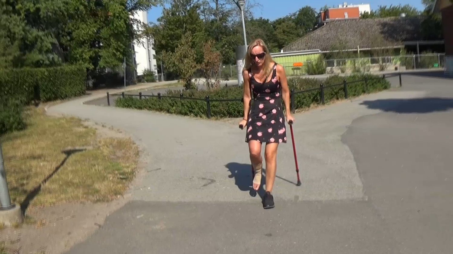 Stefanie has picked up a couple of things from a friend that our photographer now has to carry because Stefanie has her right foot in a bandage and is forced to use crutches after spraining her foot badly.After a while Stefanie stops and says that she does not like the new crutches she got at the hospital at all when they give her blisters in her hand.Stefanie sits down and rests on a bench and when our photographer films the bandage and the little toes, Stefanie puts a band-aid on the bladder in her hand.
