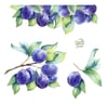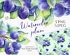 Juicy plums. Fruits elements and borders with leaves and branches. Plum seamless patterns