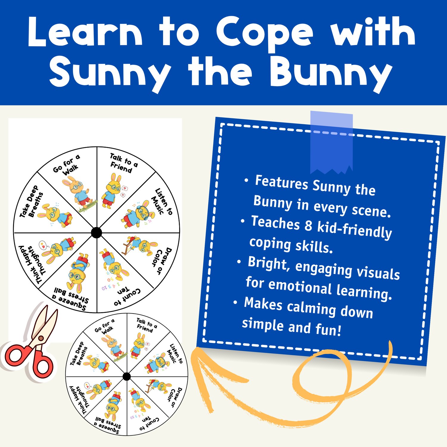 Help students learn coping skills, emotional regulation, and self-calming strategies with Sunny the Bunny! This interactive coping skills spinner is a fun, hands-on SEL activity for kids that promotes calm-down routines, mindfulness, and positive behavior — perfect for classrooms, counseling sessions, or special education settings.
